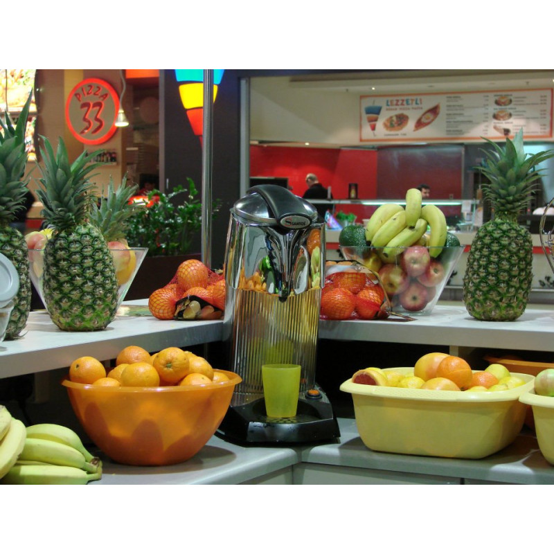 It was designed to meet the new expectations of the market. Indeed, the ever-increasing demand for fresh fruit juices pressed "on demand" has highlighted new requirements: even more performance and power and easier to use and clean.The new lever juicer 70 “Evolution” combines all the requirements to meet the new market requirements whilst being able to make juice by the glass or in jugs.It offers a greater juice extraction speed thanks to the innovative spiral reamer profile and the high motor speed (1,500 rpm).It is the only product on the market having a reamer which spins the pulp by centrifugation (higher output) and a unique clutch/brake system which provides an automatic start as soon as the fruit is introduced.Disassembly and cleaning are quick and easy thanks to the various removable accessories: bowl, reamer and cup which can be removed without tools and which can be put in the dishwasher.Lastly, its efficiency provides fast work in complete safety (the reamer stops when the lever is raised) and its design makes it a real counter tool which fits in with modern decoration trends.The operating simplicity of the new lever juicer no. 70 makes it an essential tool for the barman: a demonstrative appliance which is easy to use and clean and which is adaptable (taking all sizes of oranges and also all types of citrus fruit).This lever citrus juicer is designed for all those in the trade offering on their menus fresh fruit juices or smoothies (juice bars) and more generally for restaurants, bars, cafés, hotels, collective caterers, etc.