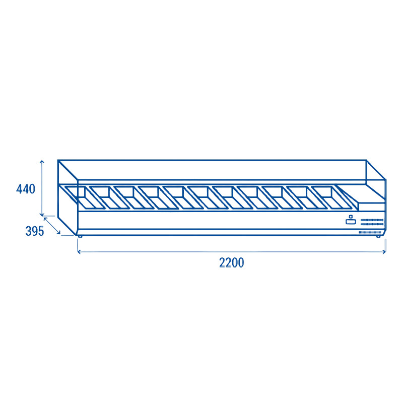 Ширина 2200 мм, VRX 22/38 подходит для емкостей 10xGN1/3 (не включены в комплект), оснащена цифровым термостатом и регулируемыми ножками в стандарте, а также высокими ножками из нержавеющей стали (140-210 мм) в качестве опции.